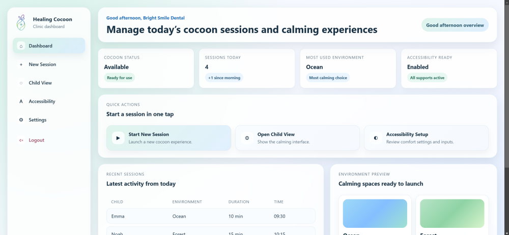 The concept of the Healing Cocoon is to transform clinical environments into calming and immersive spaces.